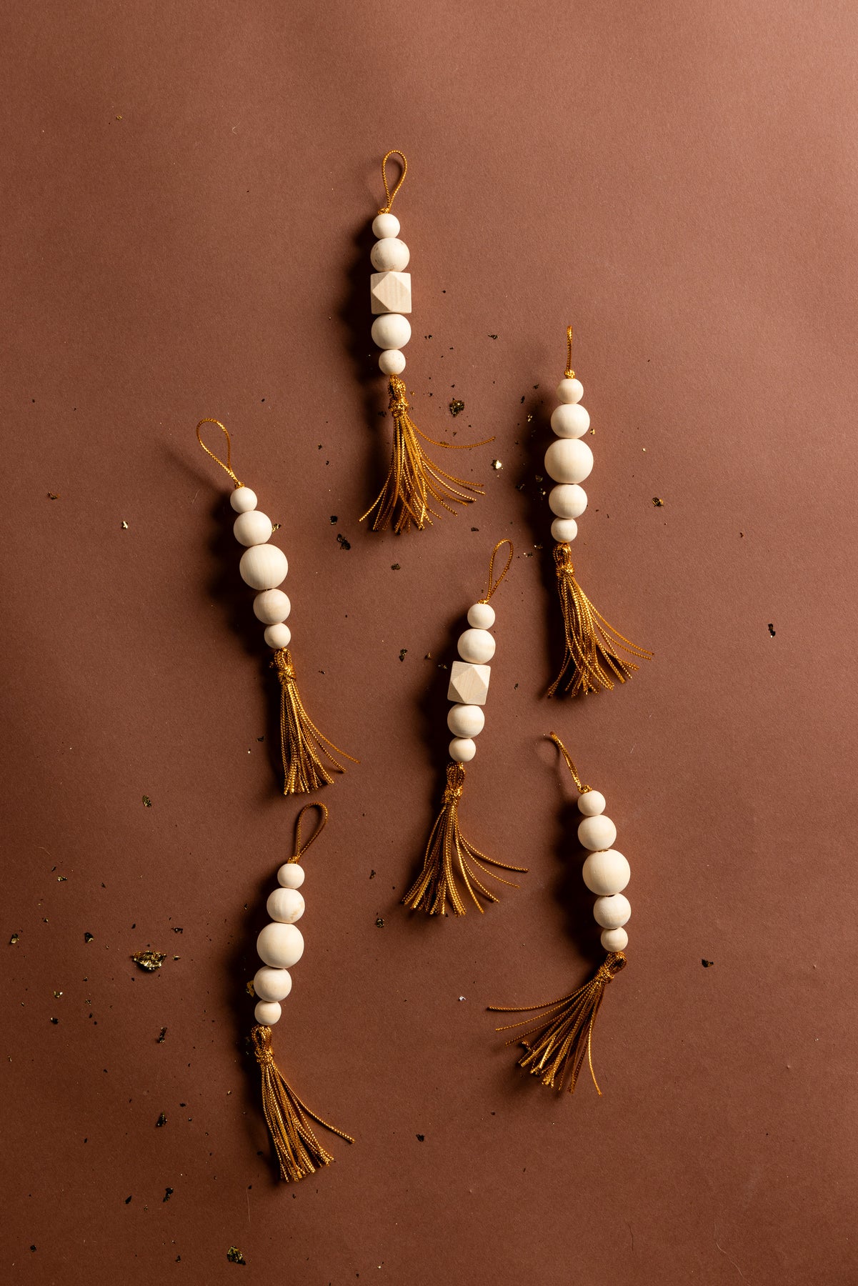 Decorate your tree with style this holiday season! This set of 6 ornaments are made with wood beads and handmade tassels, adding a touch of charm and warmth to your home. Hang them on your tree or use them as charming accents throughout your space.