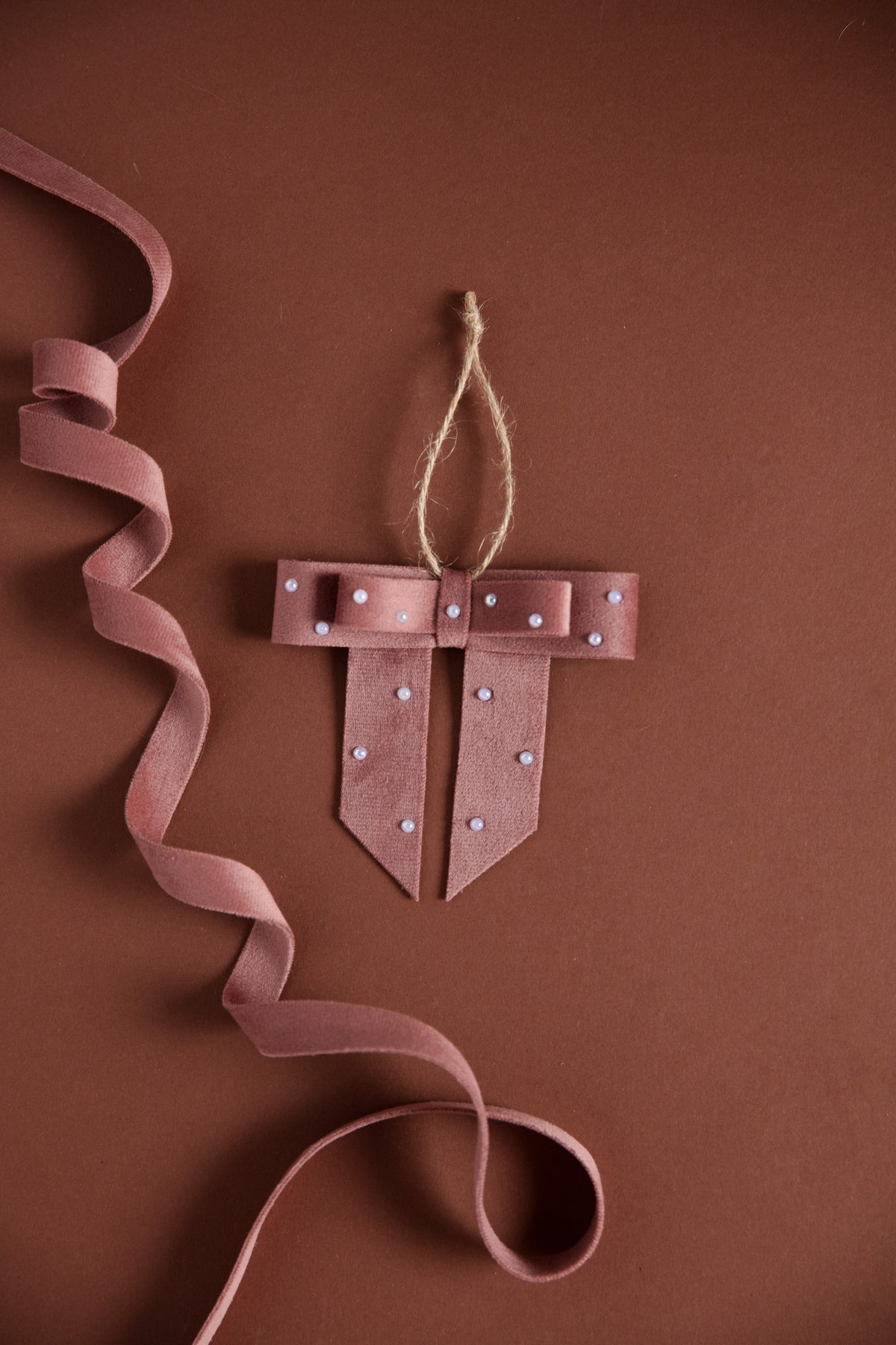 Add a festive touch to your Christmas tree with this handmade rose gold velvet ribbon threaded with pearl accent ornaments. Soft and elegant, it’s perfect for creating beautiful bows or garlands that bring warmth and charm to your holiday decor. Set includes 3 ornaments.