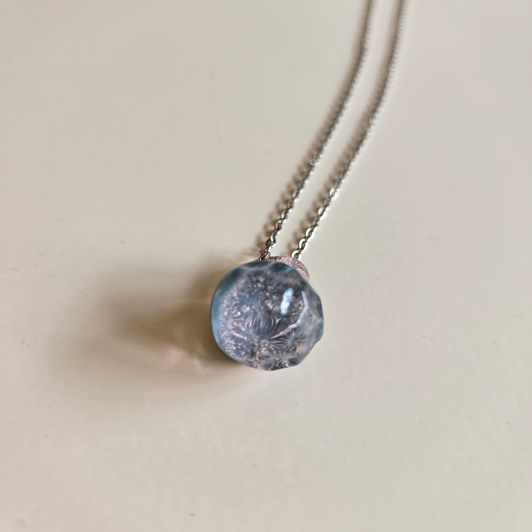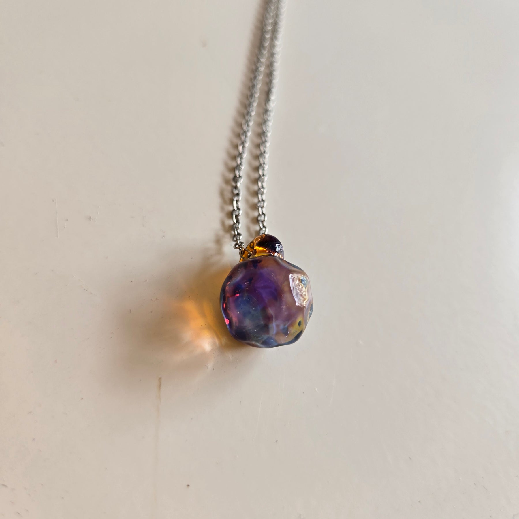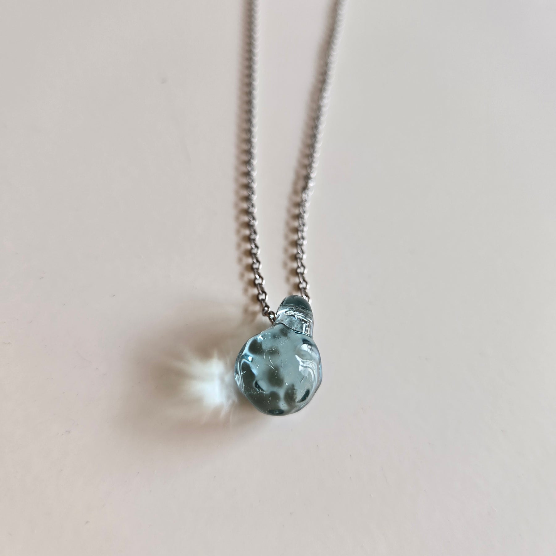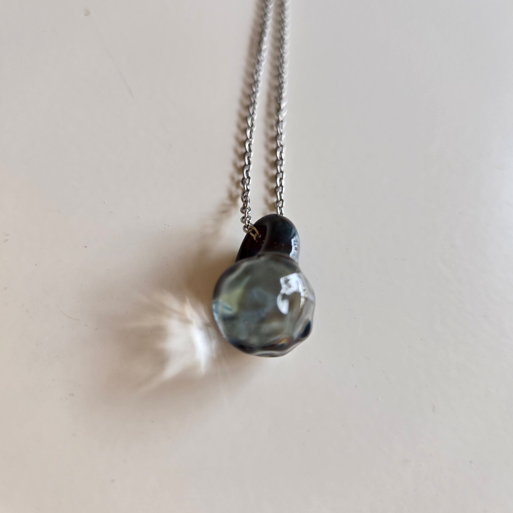 Handcrafted glass blown pendant by artist Powlino that catches the light beautifully, creating shimmering reflections reminiscent of water dancing across glass. Each piece is unique, showcasing the artist's skill and attention to detail. Perfect for anyone who appreciates wearable art that transforms with every movement and angle. A conversation starter that brings natural elegance to any outfit.