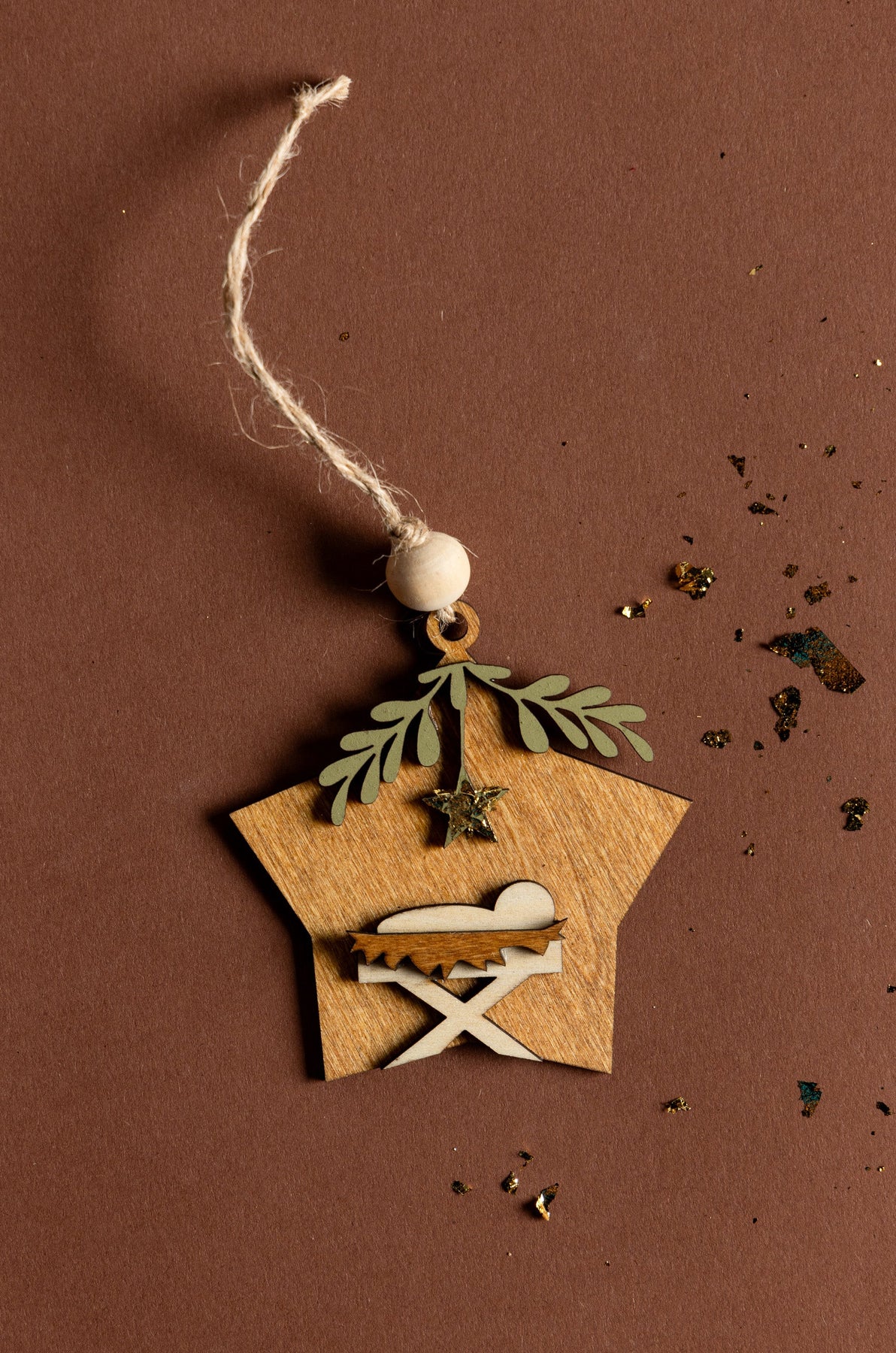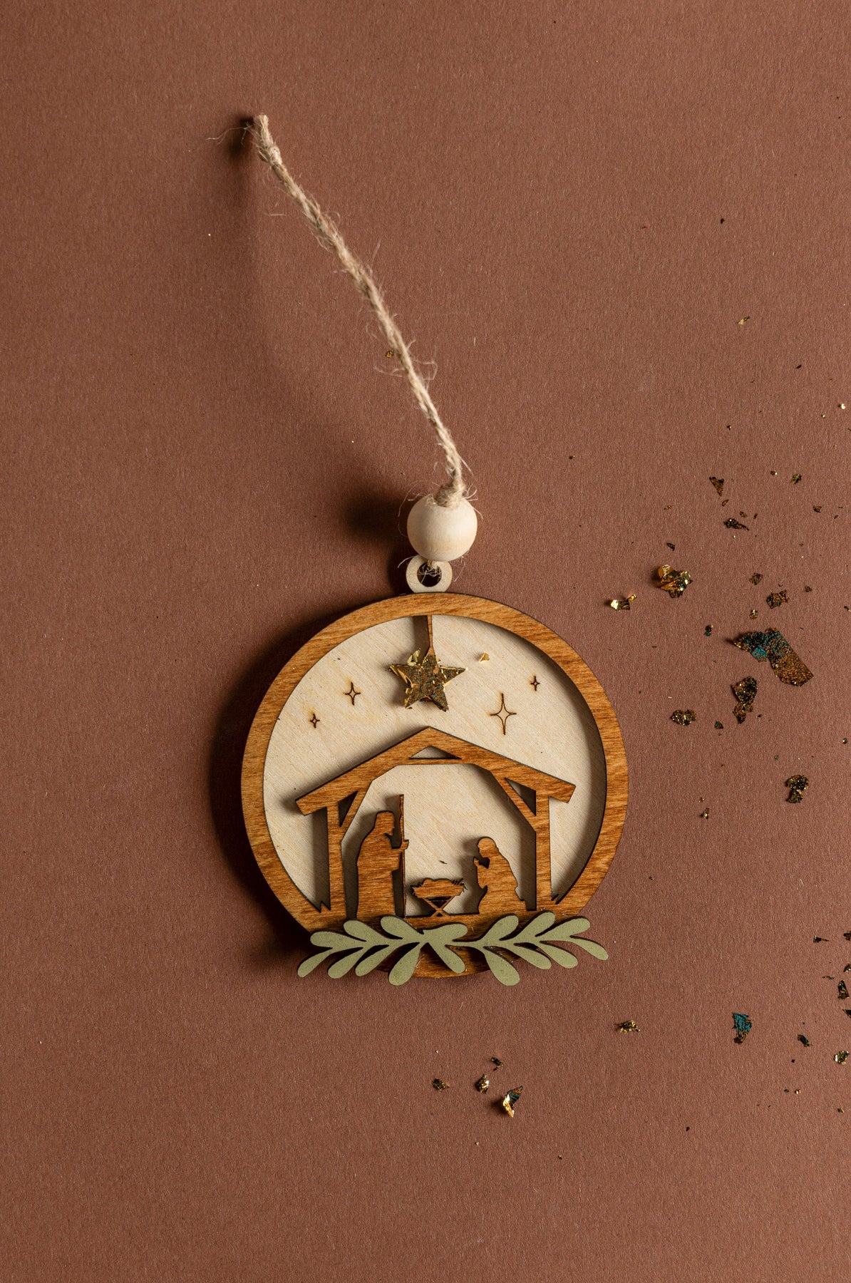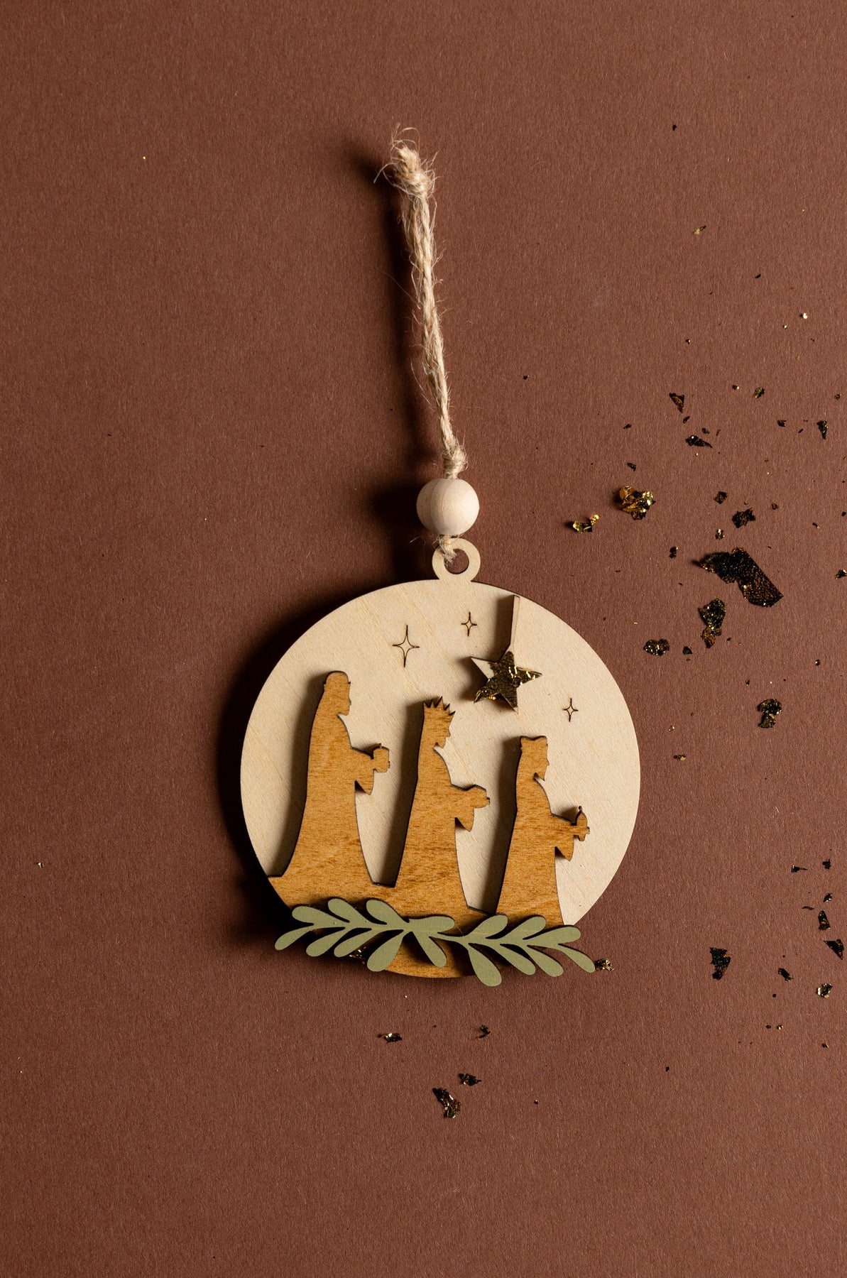 Each set includes four handmade wooden ornaments featuring the 3 wise men, baby Jesus, Bethlehem star, and nativity scene. Gold leaf and wood bead accents add a modern boho touch, making it a must-have for every tree.