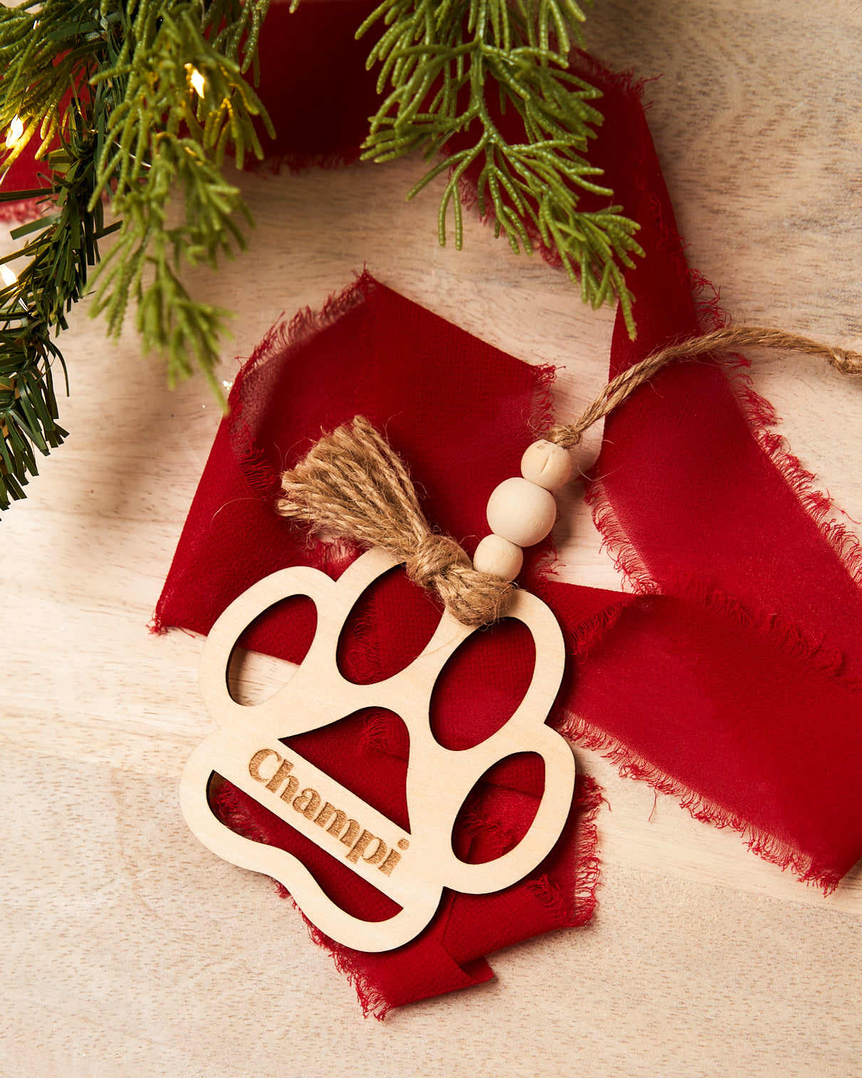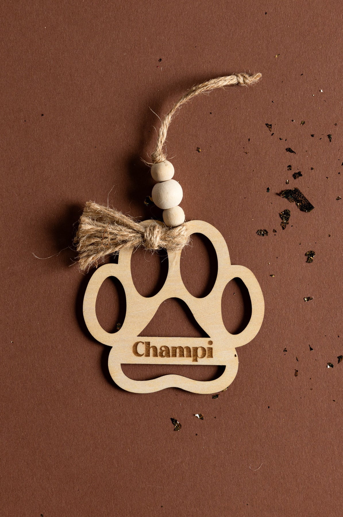 Celebrate your furry friend this Christmas with our Paw Ornament! Made of custom lasered wood with your pet's name engraved, this ornament is the perfect way to honor your cat or dog. Complete with metal bell, tassel, and wood bead accents, this unique ornament will add a special touch to your holiday décor.